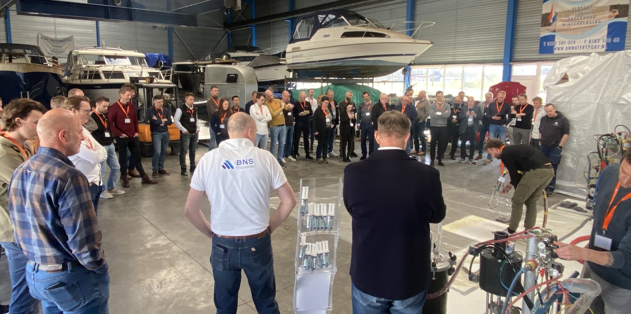 Door onze gastheer CT Platon werd de vertaalslag naar de praktijk gemaakt. Na een introductie van het bedrijf door Colin Stuij, demonstreerden Dennis Struij (CT Platon) en Stef Jaspersen (BNS Industrial) verschillende lijmen en verwerkingstechnieken. Van het verlijmen van grote composietdelen tot spraytechnieken en injectieverlijming — de toepassingen werden zichtbaar en tastbaar gemaakt.